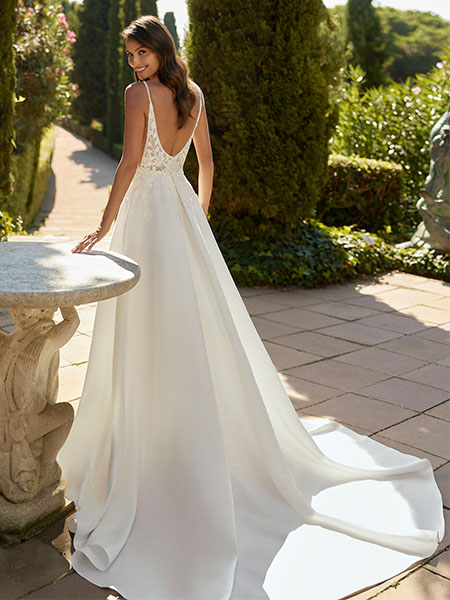 Simple ballgown-style wedding dress made with satin combined with lace and beadwork. Featuring a plunging neckline, plunging back with straps, and skirt with a side slit.