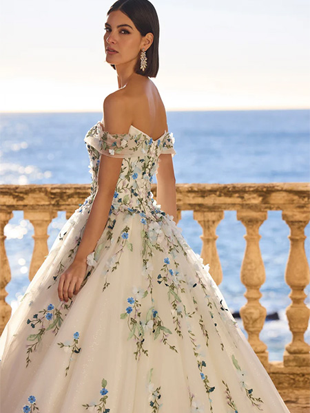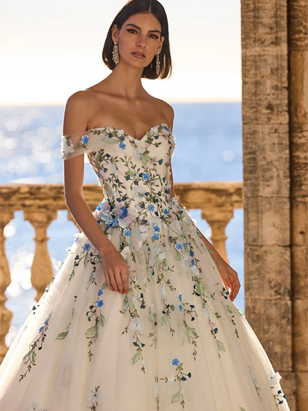 A botanical princess ballgown wedding dress showcasing vibrant floral lace appliqués, an off-the-shoulder neckline, and delicate sheer cap sleeves. Dress and Stole